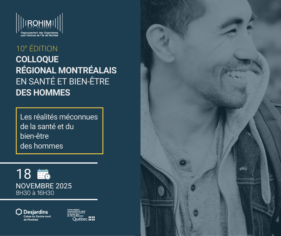Sous le thème Les réalités méconnues de la santé et du bien-être des hommes, le ROHIM est heureux de vous présenter la programmation de la dixième édition du Colloque régional montréalais en santé et bien-être des hommes qui se tiendra le 18 novembre prochain, au Centre St-Pierre.