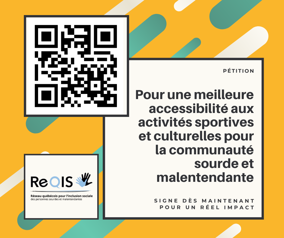 Le ReQIS a lancé une pétition pour souligner les besoins en accessibilité communicationnelle des événements culturels et sportifs. Dans les prochaines semaines, nous souhaitons récolter des signatures via le site Change.org. Beaucoup d’informations complémentaires se trouvent sur le lien externe du formulaire.